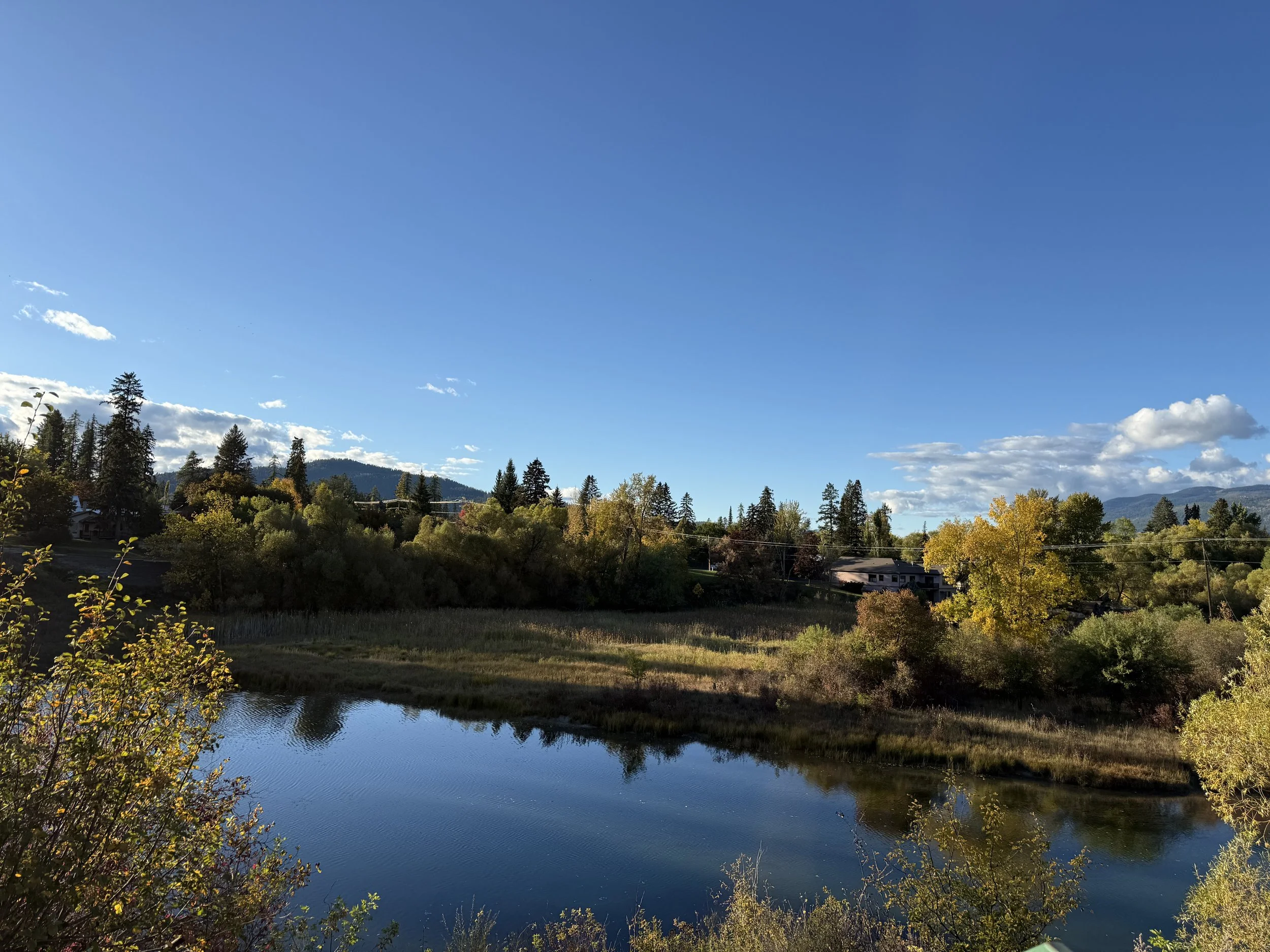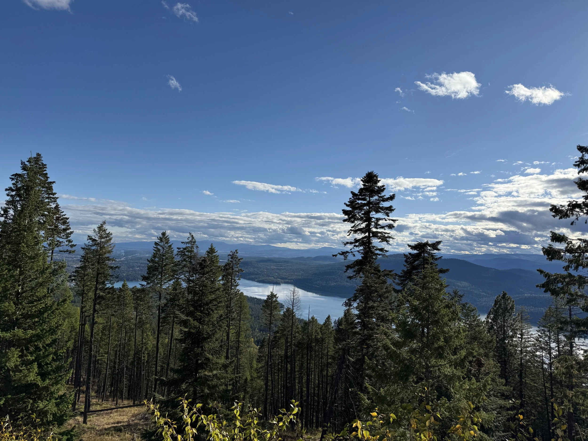 After a hearty meal and some soul-filling conversation, we continued the short drive to Whitefish, ready to kick off the day with an easy hike on Lion Mountain Trail. The weather couldn’t have been better—sunny, cool, and perfectly crisp. The trail wound gently through thin woods, opening up to glimpses of mountain peaks in the distance. Eventually, we reached the overlook at the top, where Skyles Lake shimmered below—a small, glassy patch of water surrounded by golden trees. It was peaceful, quiet, and effortlessly beautiful.