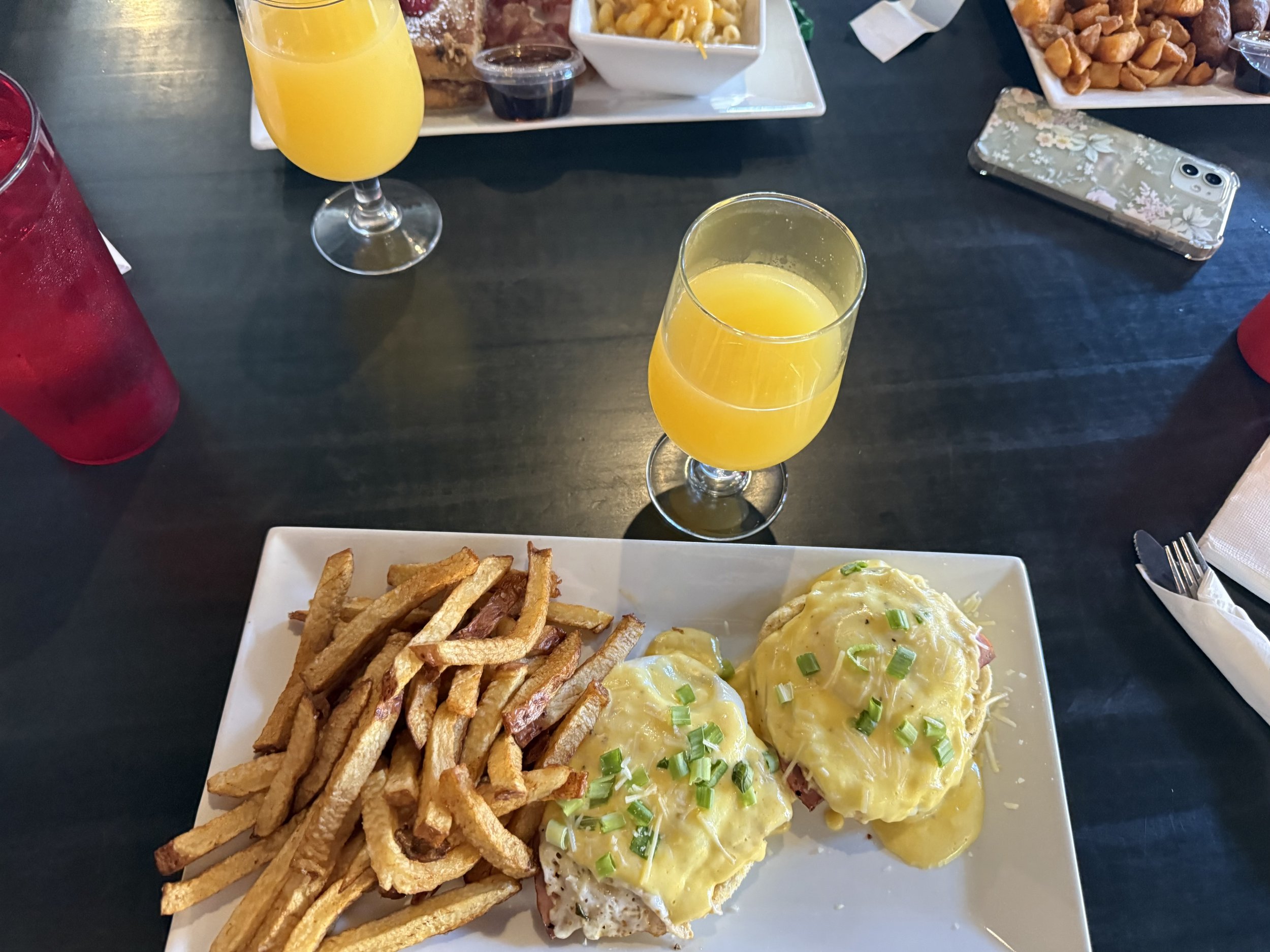 I returned from my walk, showered, and got ready to meet my little brother Marc, who happened to be visiting from Fargo. I chose The Spud Jr. for its brunch and bottomless mimosas—I knew he’d like it there. It’s become my go-to brunch spot in town: laid-back pub vibe, solid menu, and especially good mimosas and Bloody Marys. I ordered the Eggs Benedict Arnold; he went with waffles.