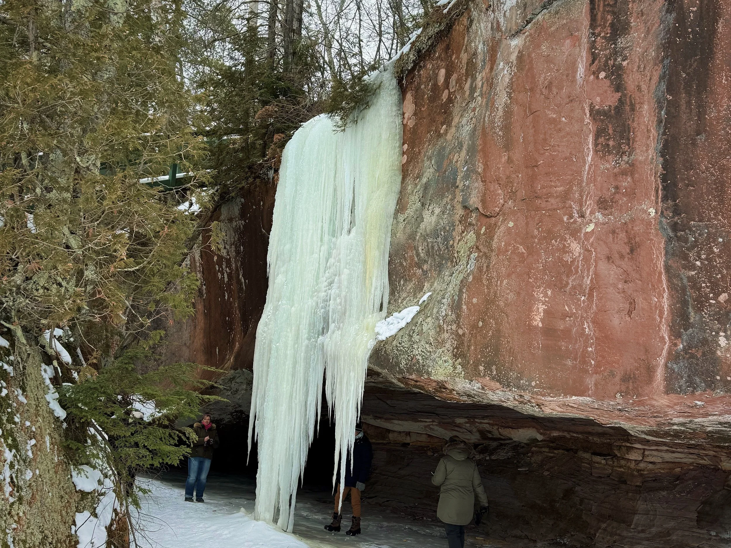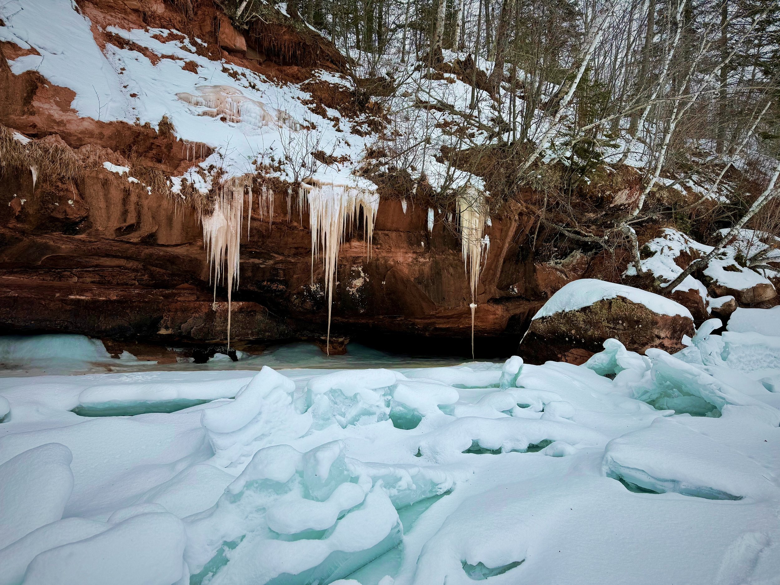 Another stop opened up to a wide stretch of quarried rock—the rusty brownstone swirling into powdery white snow like Cinnamon Toast Crunch. Gobs of smaller icicle formations hung like stretched-out gum stuck along the shoreline, frozen mid-drip.