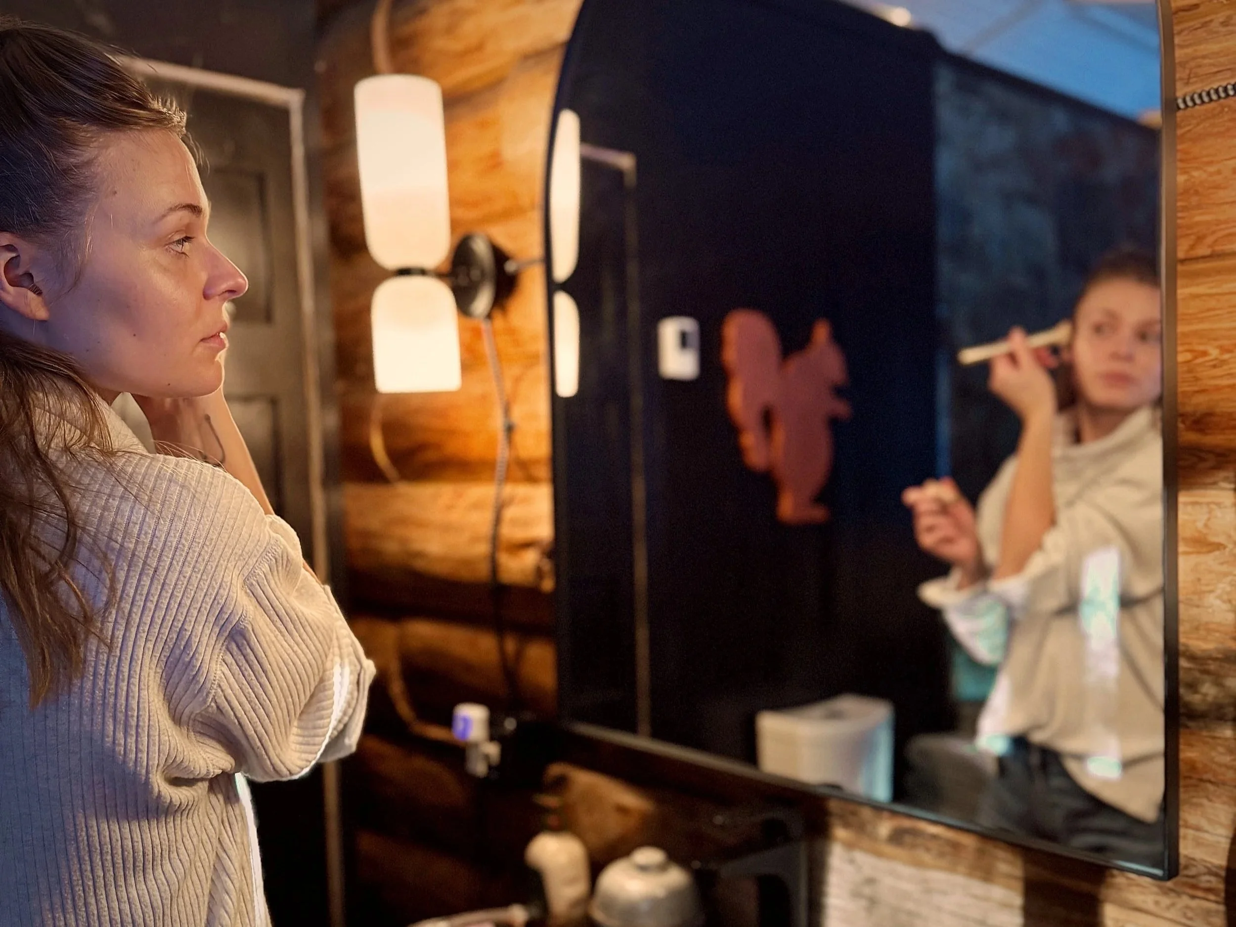 Morning arrived with soft, gentle light spilling through the wall of pine trees surrounding the little log cabin. I rolled over and checked my phone: 7:30 a.m. I had made it through the night. Barely. The last bundle of logs I’d shoved into the fire around 5 a.m. was still going strong—the flames laughing and dancing. Sure, nowww she’s happy.