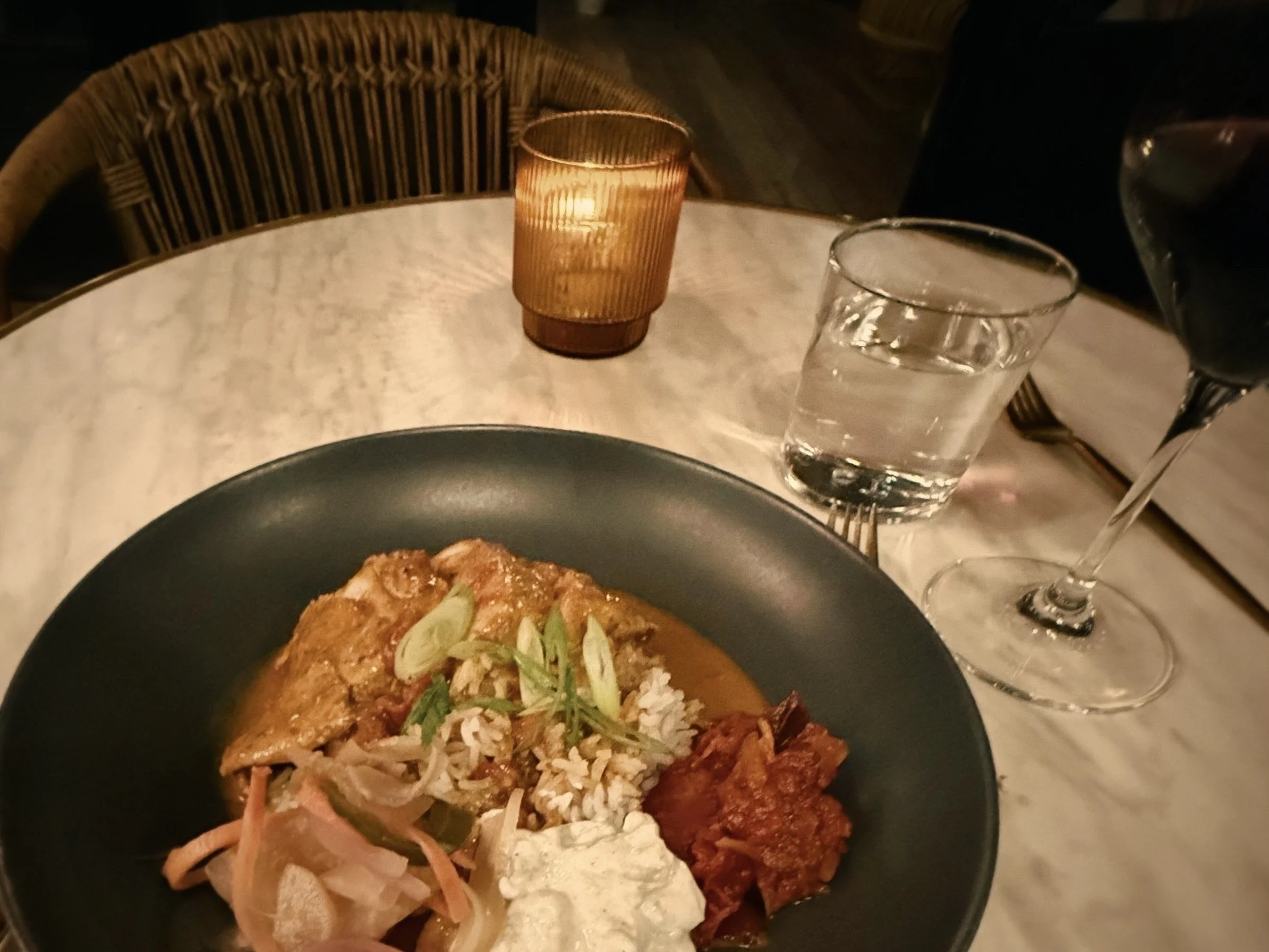 I tried to stay off my phone and just be present, but caffeine on an empty stomach and the winding drive in the dark left me jittery. I couldn’t stop scanning for ice, deer, other cars—a cautious alertness that lingered even as I settled into the restaurant’s safety. I shifted between checking my phone and taking bites of my butter chicken curry or slow sips of red wine.