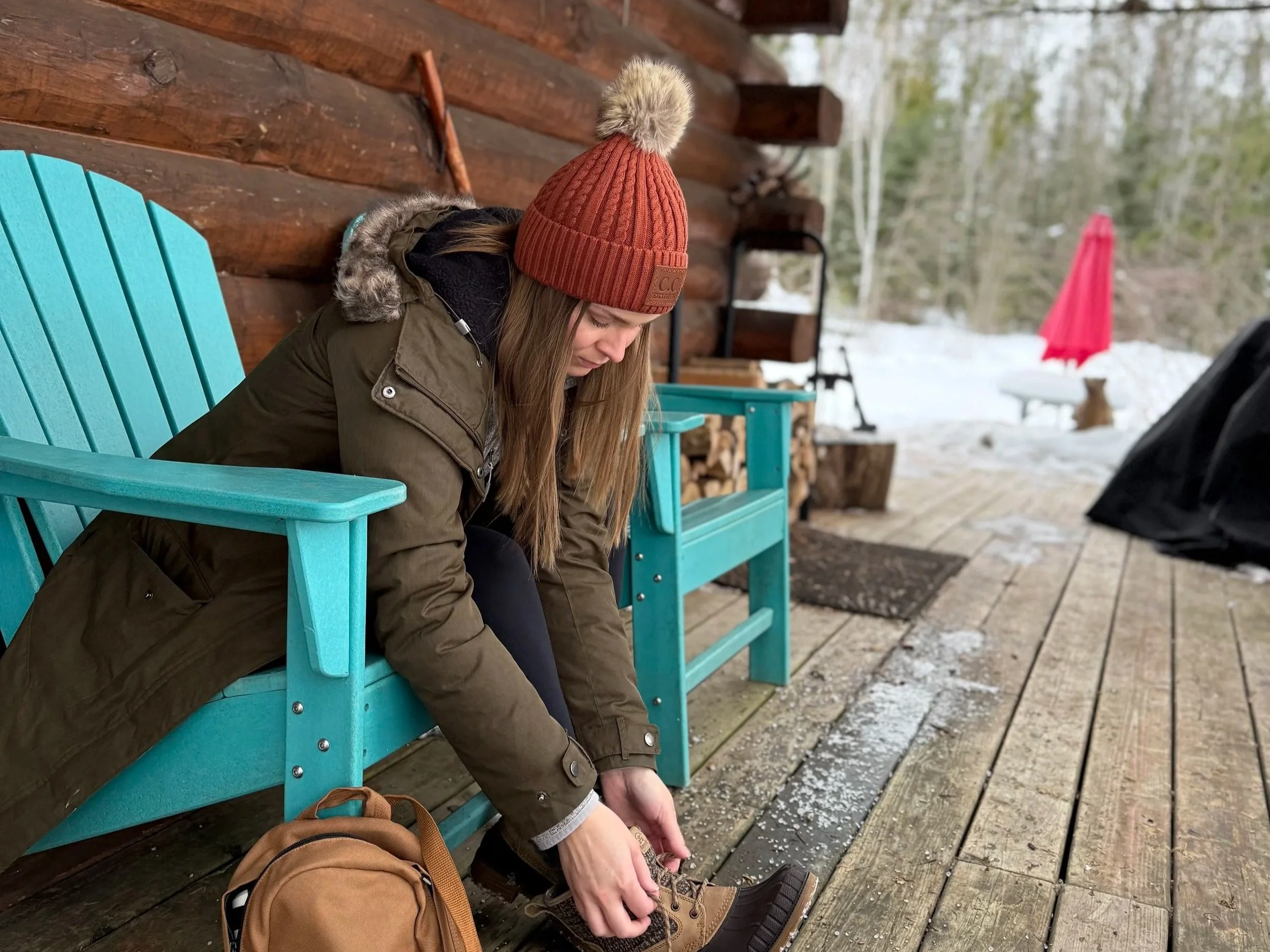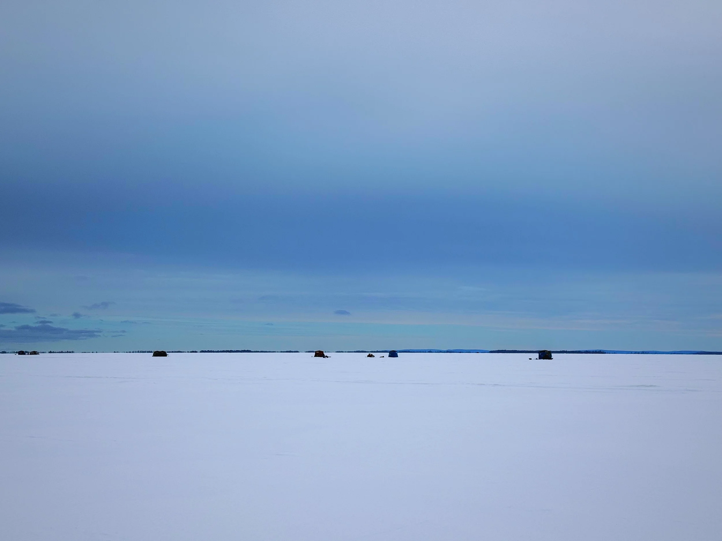 By the time we turned back, a throbbing soreness had settled into my hips, the kind I knew I’d need to stretch out once I made it back to the cabin. Snowmobiles whirred across the lake in the distance, the horizon dotted with brightly colored ice fishing houses. We took small breaks along the way, waiting for others to catch up.