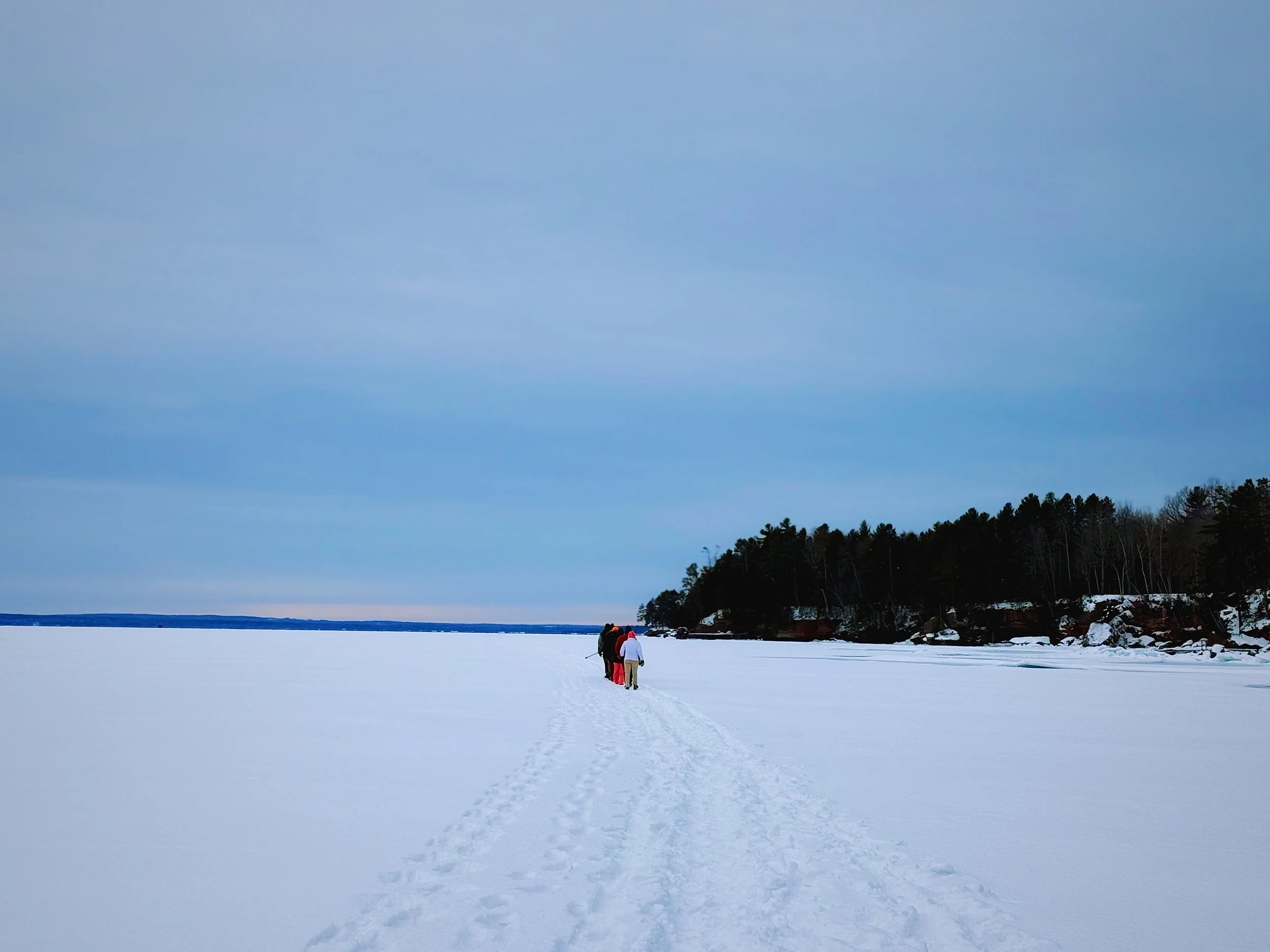 Those CRACKS!—from the waves rolling beneath the ice—followed us all the way back to shore, making my heart jump every single time. Each one sparked the same intrusive thought: maybe this will be the moment the ice splits open and swallows us whole.